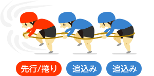 ラインには色々な構成がありますが、基本は、自ら風を受けて先を走る [ 先行/捲り(自力型)] の後に、少ない空気抵抗で走って最後に追込む [ 追込み(他力型)] が続くパターンです。